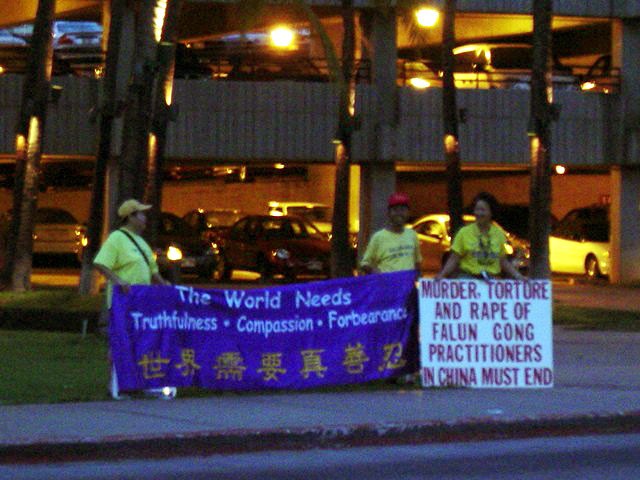 黄华华参与迫害 美法轮功学员提起诉 图为法轮功学员在黄华华进行商务活动的旅馆外呼吁停止迫害