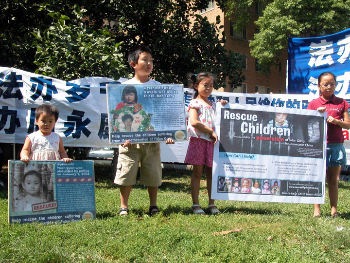 海外学员手持大陆受迫害儿童的照片在华盛顿国会山庄前集会抗议七年来中共对法轮功的迫害 2006-7-20