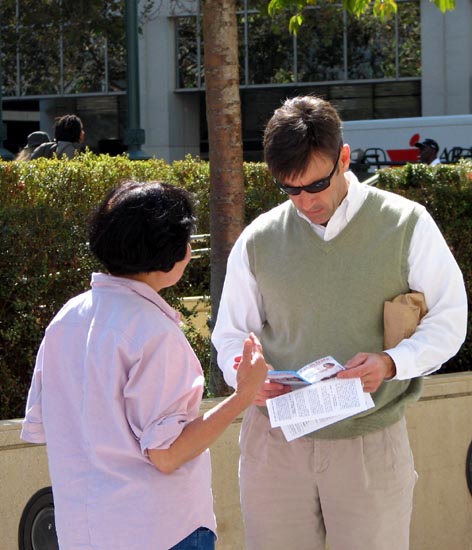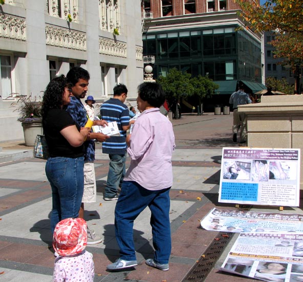 法轮功学员前往新加坡驻旧金山领事馆要求撤销对学员的非法指控,图为让路人了解真相2006-7-19