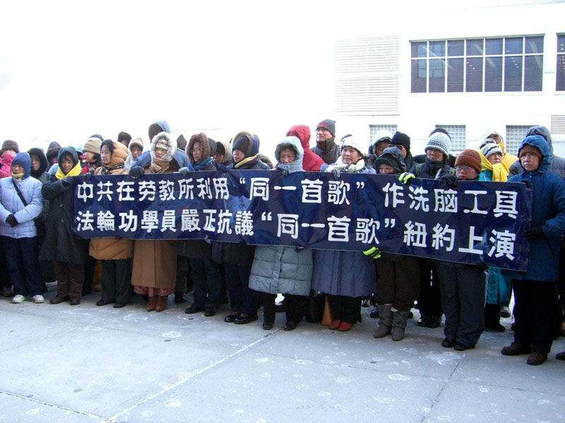 法轮功学员在纽约中领馆前集会 严正谴责“迫害伴奏曲”在纽约上演2006-1-15