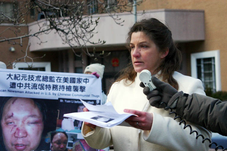 美国华盛顿法轮功学员要求禁止迫害法轮功的中共文化部长孙家正入境 图为Laura Hattan 女士在发言