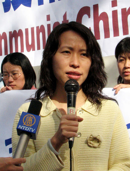 法轮功学员呼吁布什访华时向中共领导人提出停止镇压法轮功的要求 图为被非法判刑最重的法轮功学员之一的王治文的女儿王晓丹在发言