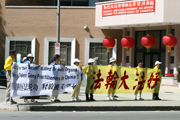 法轮功学员在中共现任党魁访美期间在中使馆前呼吁停止迫害法轮功,彻查真相 2006-4-19