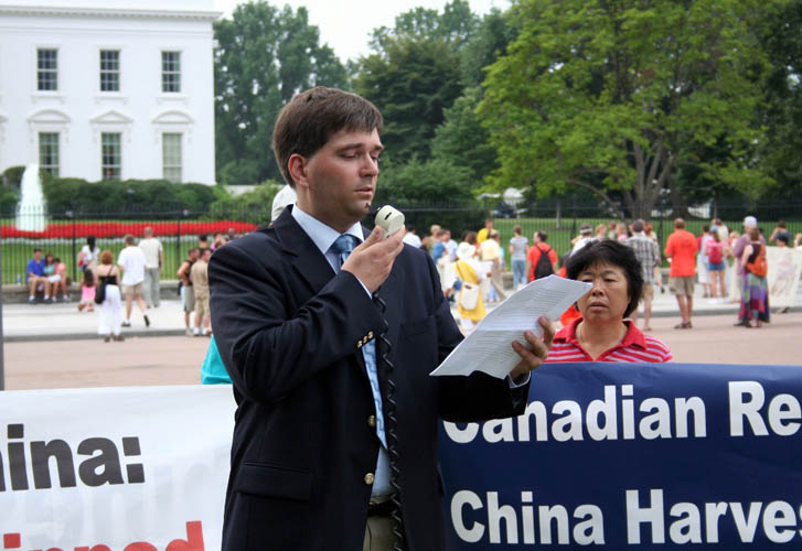 法轮功学员在中使馆前举行新闻发布会揭露中共活摘器官的暴行,图为学员发言