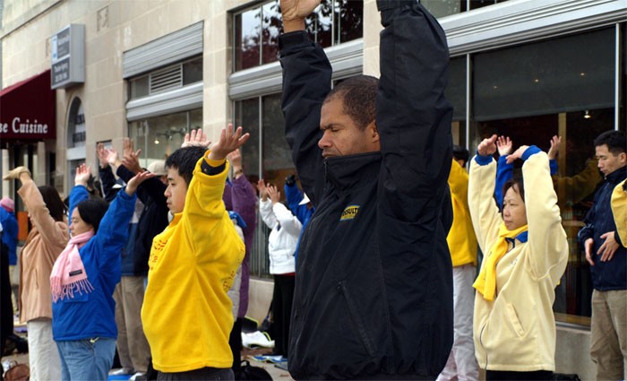 芝加哥学员中领馆前集会反迫害 - 路过的行人听法轮功学员讲真相