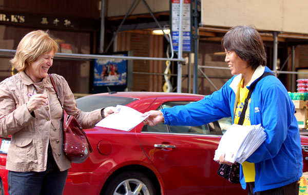 法轮功学员在纽约布碌伦最高法院前揭露中共活摘器官暴行,图为向路人讲真相2006-8-28