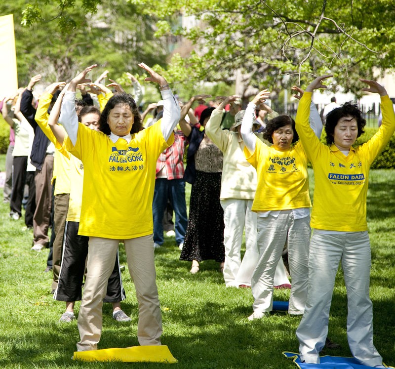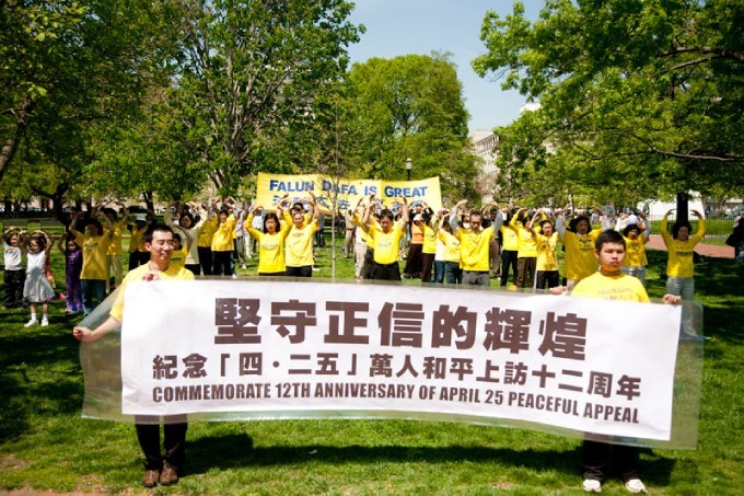华府法轮功学员在白宫附近的拉斐特广场集体炼功,纪念“四·二五”万人和平上访