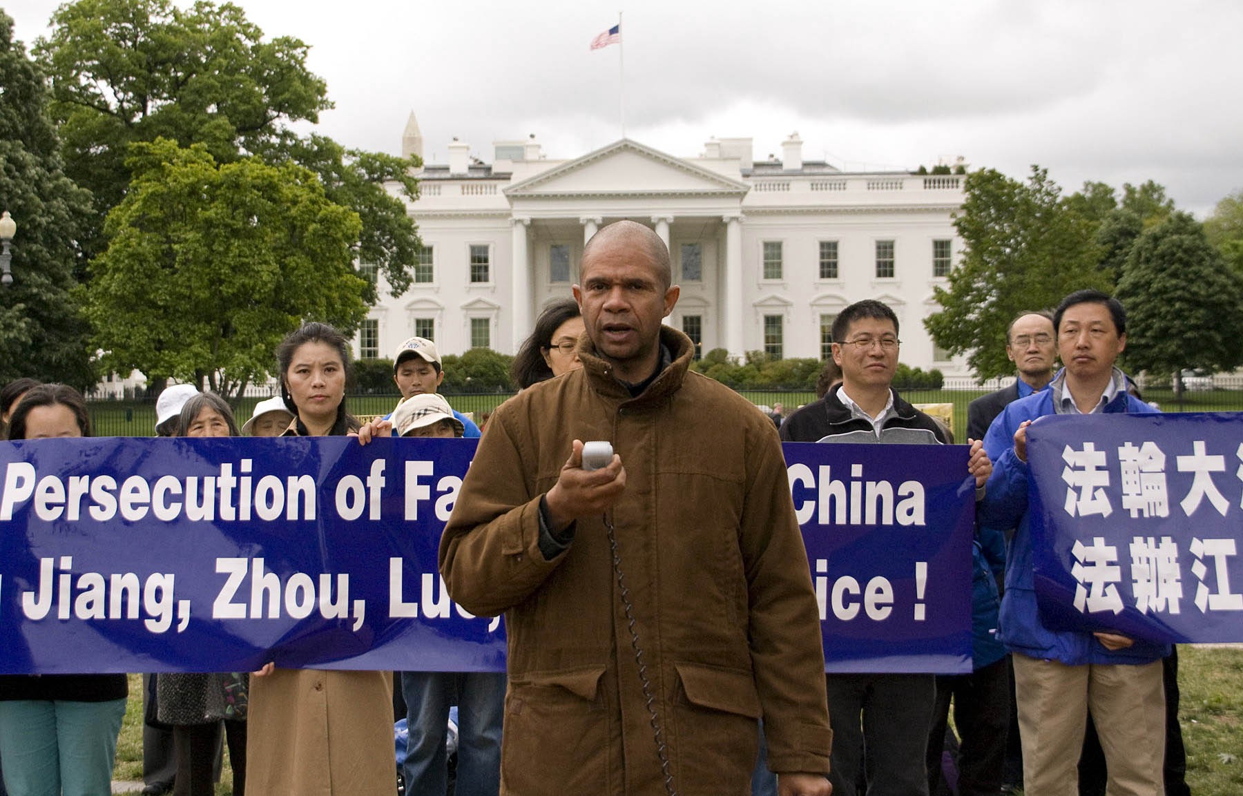 美国首都华盛顿法轮功学员在中使馆前集会,纪念“四•二五”图为吉姆•吉拉格森发言
