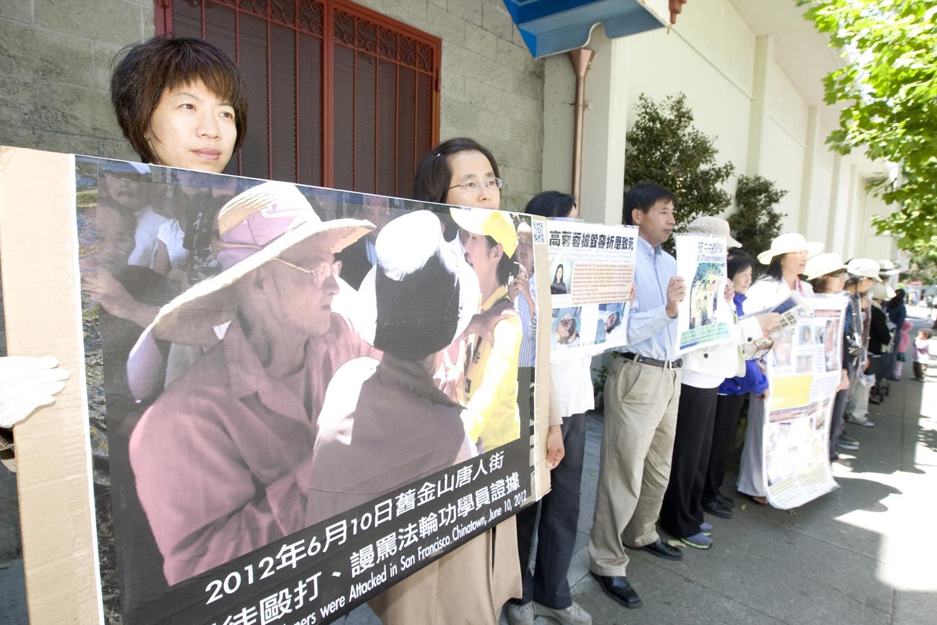 法轮功学员在中国城集会,抗议中共帮凶殴打学员并曝光中共恶行