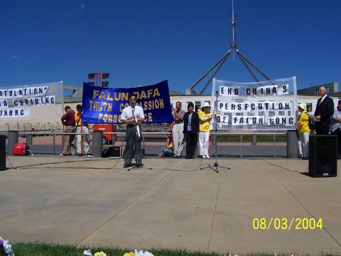 法轮功学员在澳洲堪培拉国会大厦前举行新闻发布会呼吁政府在联合国人权大会上提出议案谴责对法轮功的迫害