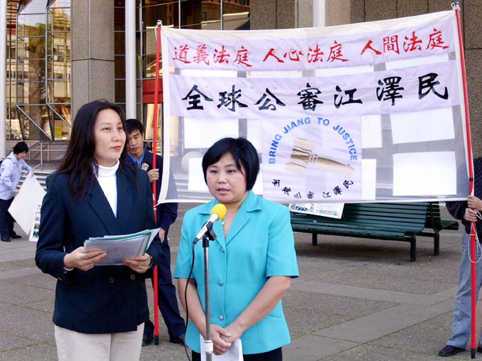 法轮功学员章翠英在澳洲纽省高等法院前举行新闻发布会