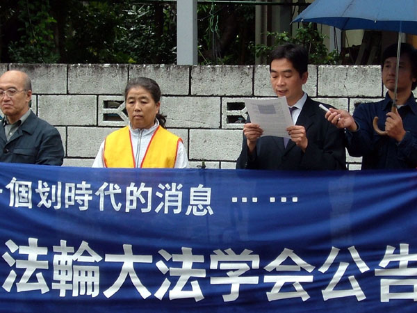 日本学员中使馆前宣读法轮大法学会公告, 正告参与迫害法轮功者,立即停止作恶 2005-10-17