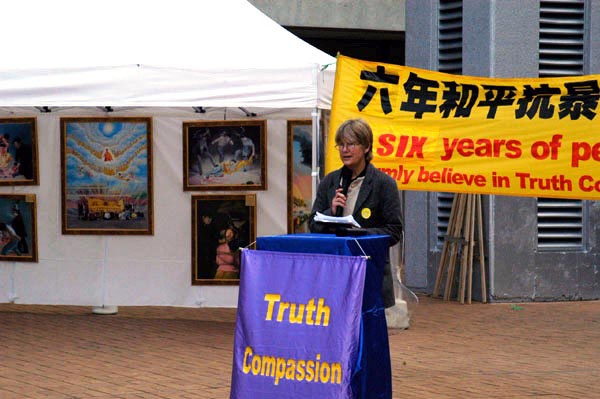 7.20六周年 悉尼法轮功学员呼吁停止迫害 图为法轮功学员戴志珍在新闻发布会上发言