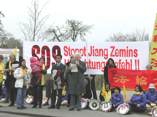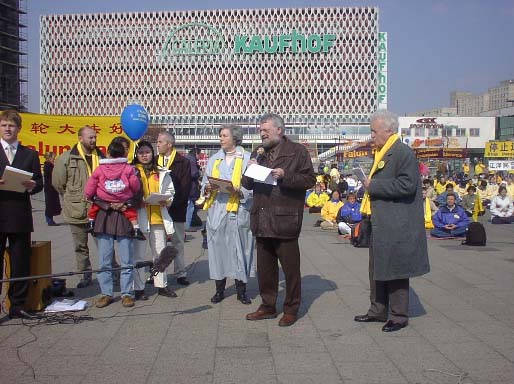 2002年4月8日德国法轮功学员在柏林亚历山大广场召开新闻发布会,英国的莫恩勋爵发言表支持