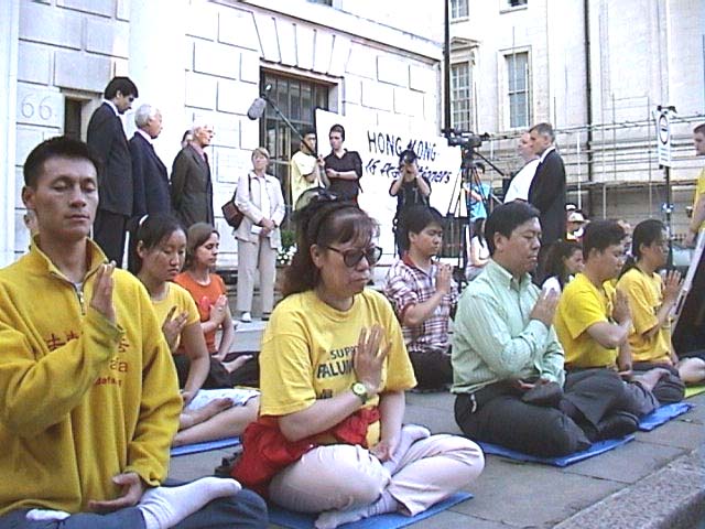 法轮功学员在伦敦中使馆前举行记者招待会,揭中共活摘学员器官的暴行,吁各界共同制止中共暴行,停止迫害 2006-7-15