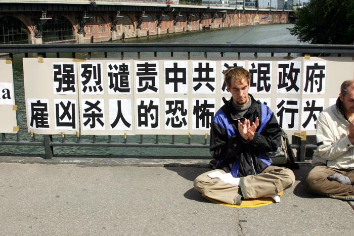 法轮功学员在中共驻巴黎使馆附近举办新闻发布会谴责中共的迫害图为学员们功法演示2008-8-19