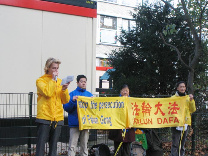 荷兰法轮功学员在中使馆前宣读大法学会公告,警告中共恶人悬崖勒马,停止迫害 -- 2005年11月16日