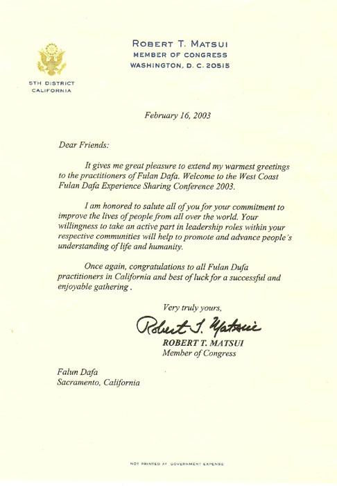Published on 2/21/2003 美国会议员罗伯特-马丘致美西法会的贺信