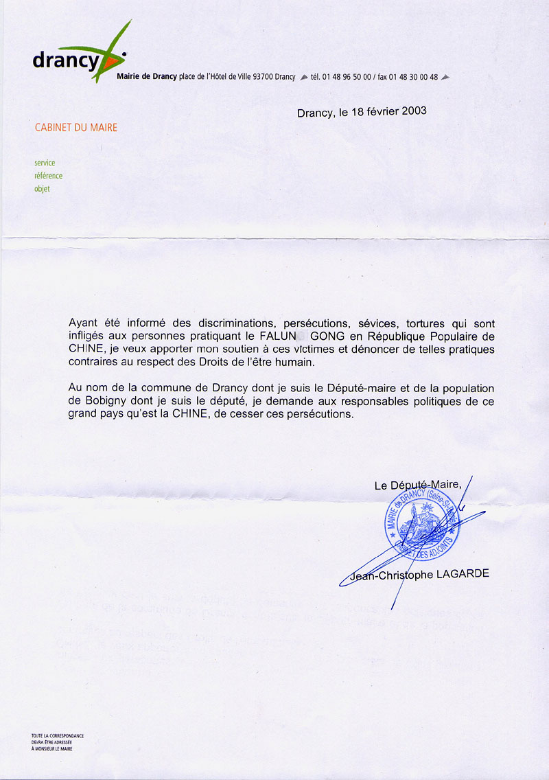 Published on 2/16/2003 法国官员、议员向法国法轮大法协会问候新年(四)