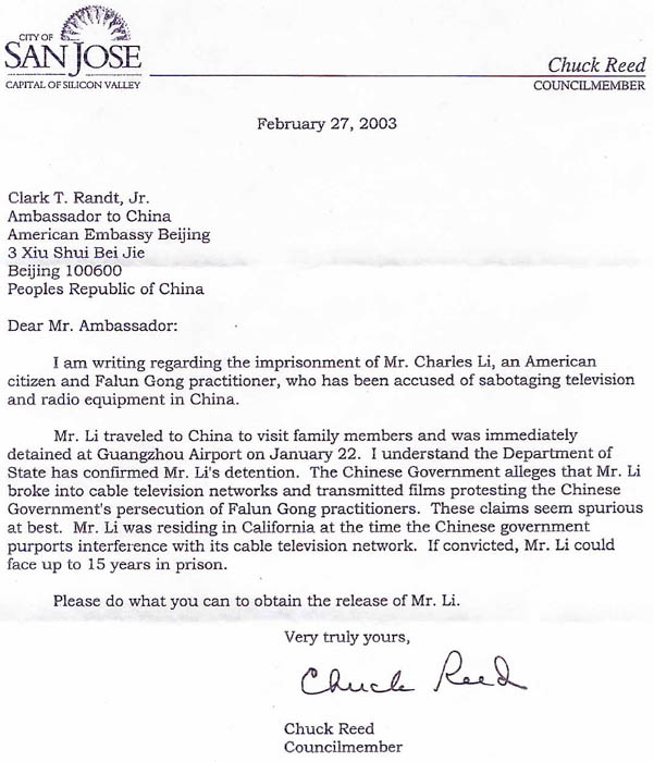 Published on 3/4/2003 加州国会议员致信法轮功学员关注查理斯·李被捕一事