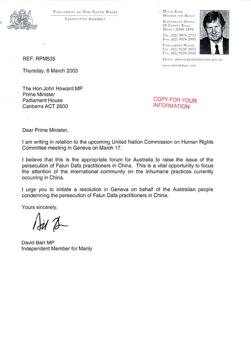 Published on 12/5/2002 澳洲总理办公室复信关注在中国的法轮功学员亲属处境