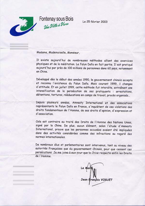Published on 3/4/2003 法国宣布“法轮大法日”一周年之际市长重申支持法轮功(图)
