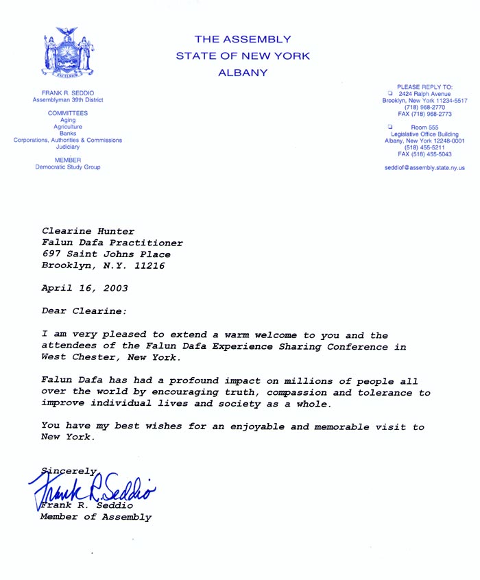 Published on 4/23/2003 美国各级政府官员就纽约法轮大法法会发来贺信