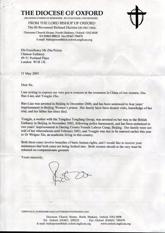 Published on 5/30/2003 英国牛津大主教就法轮功学员国内亲人的遭遇致信中国驻英大使