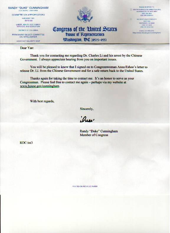 Published on 6/16/2003 圣地亚哥国会议员兰迪-坎宁安给大法弟子的回信