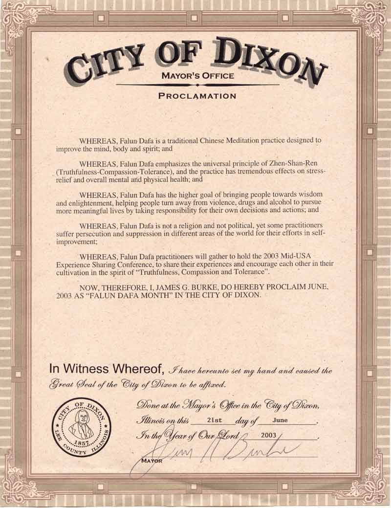 Published on 6/25/2003 伊利诺依州迪克森市市长褒奖法轮大法