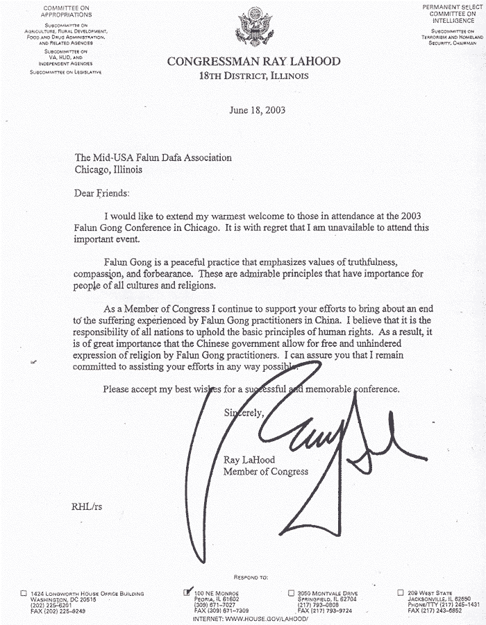 Published on 6/27/2003 美国会众议员瑞-拉胡得致美中法轮大法学会的贺信