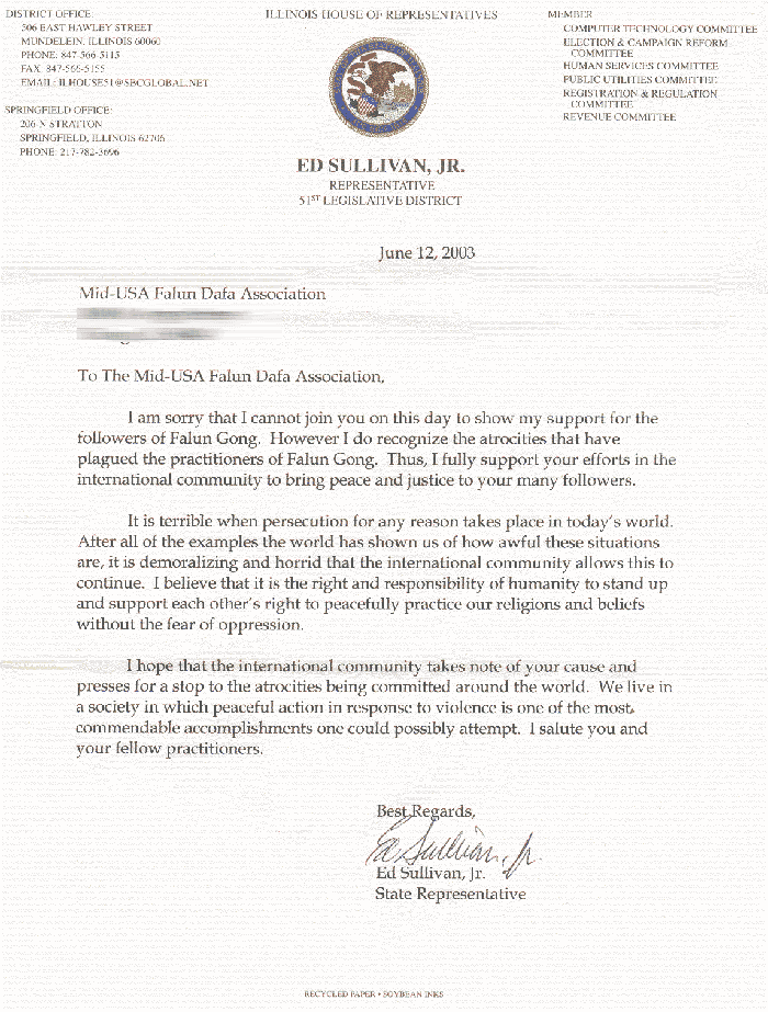 Published on 6/26/2003 伊利诺依州第51选区众议员致美中法轮大法学会的贺信