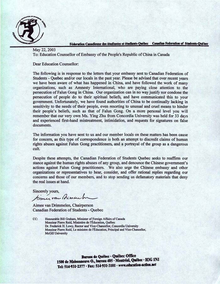 Published on 6/5/2003 加拿大学生联合会要求中国政府停止散发歪曲事实、否认真相的材料