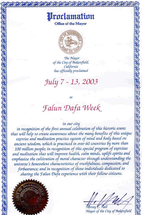 Published on 7/16/2003 加州贝克斯菲尔德市市长宣布“法轮大法周”