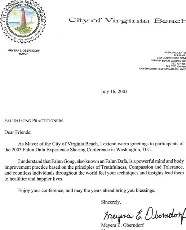 Published on 7/21/2003 弗吉尼亚州佛吉尼亚海滩市市长致信庆祝华盛顿DC法会召开
