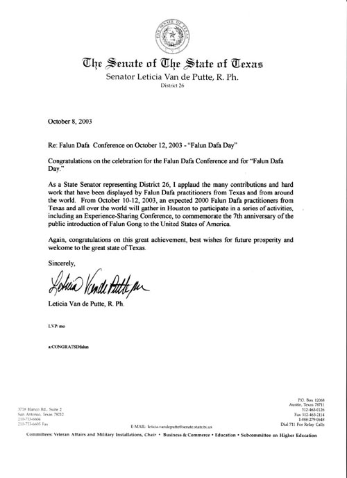 德州州务卿祝贺世界法轮大法日及大法洪传12周年