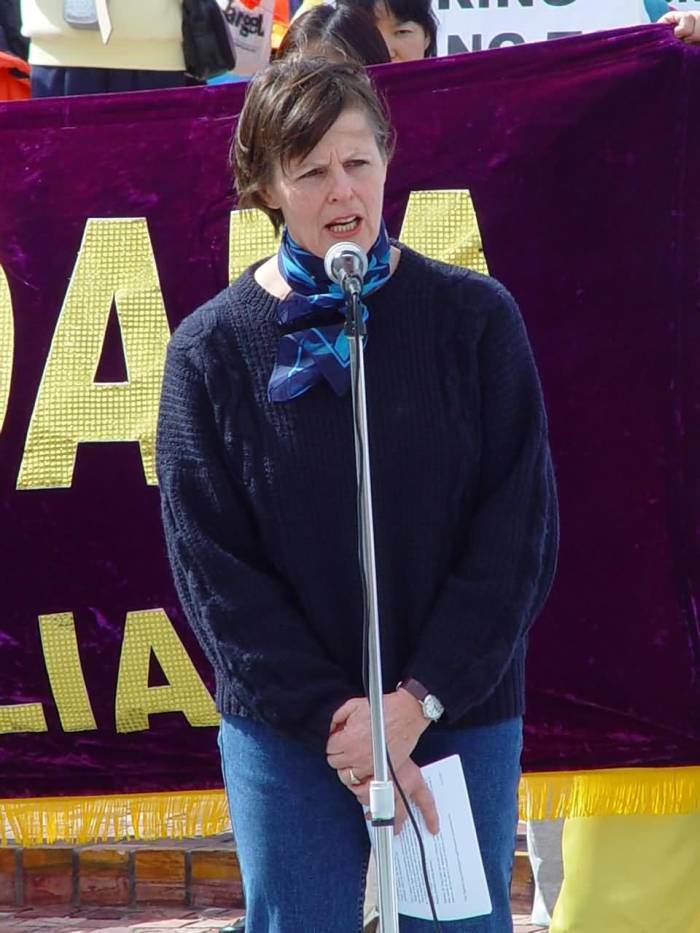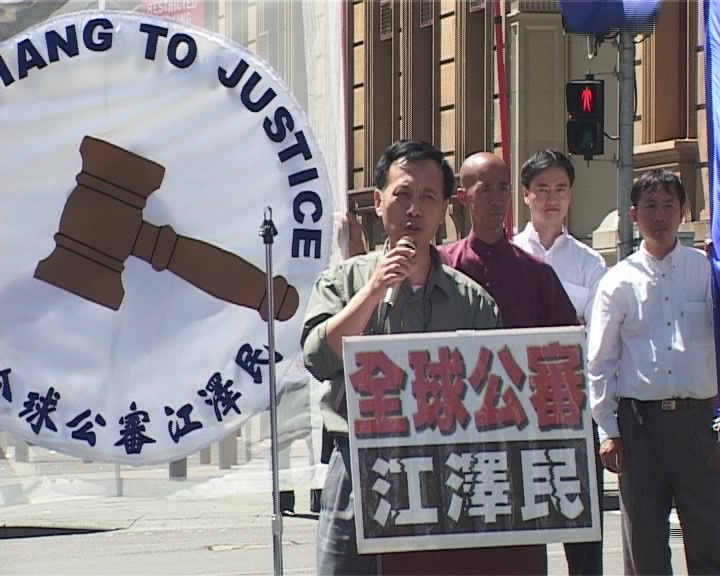 法轮功学员汇集澳洲 澳洲服务业工会发言人莱特(Matt Wright)发言说工会强烈反对迫害和强制劳动