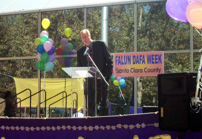 加州洛杉矶县“法轮大法周”,杰夫.普朗市长作主旨发言,指出中国领事馆的宣传材料都是不可信的