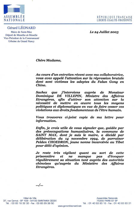 法国议员热拉尔·莱奥那尔致信法轮功学员 全力支持制止中国迫害法轮功