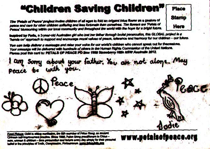 在中国对法轮功的残酷镇压中失去父亲的小法度不断的收到来自世界各地的凝结着爱心的莲花明信片