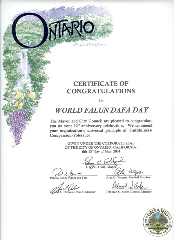 加州安塔瑞市市议会祝贺“世界法轮大法日”