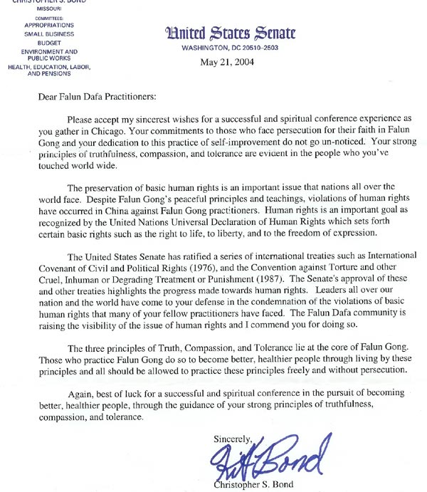 美参议员克里斯多福-邦德致信祝贺芝加哥法会