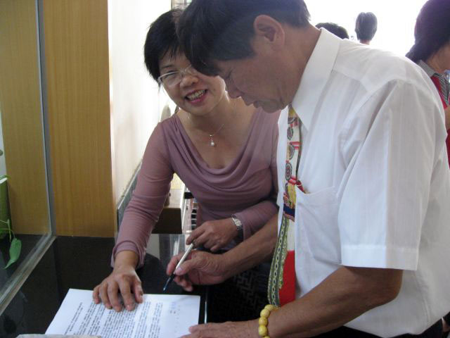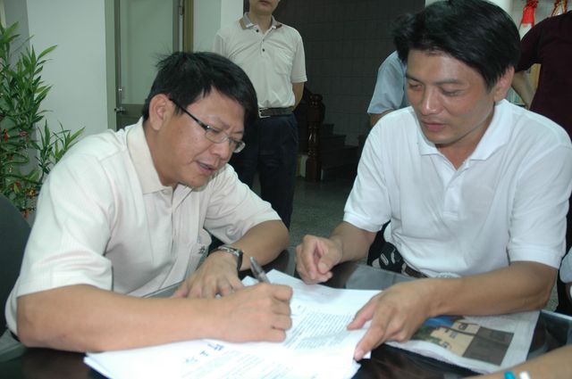 台湾嘉义市民连署,制止中共迫害图为嘉义市议员蔡文旭(右)接受反迫害签名联署书2008-7-20