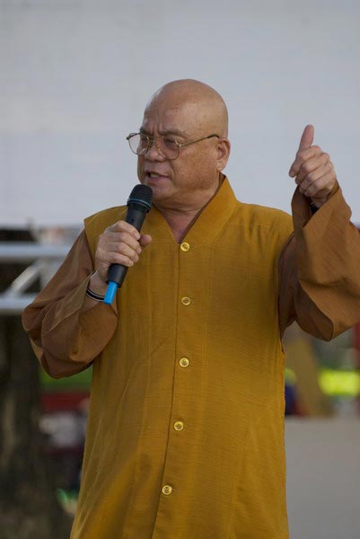 法轮功学员参加费城亚太裔传统月活动,图为宾州州长亚裔委员会委员、越南社区代表Truong N. Phuong接受法轮功学员赠送的莲花和真相资料,合影留念