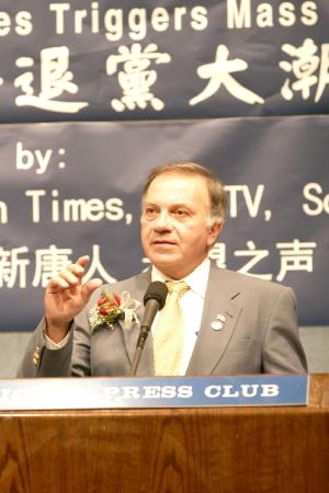加拿大各界在奥运前谴责中共迫害人权图为前联邦司法部长Irwin Cotler在新闻发布会上发言2008-8-7