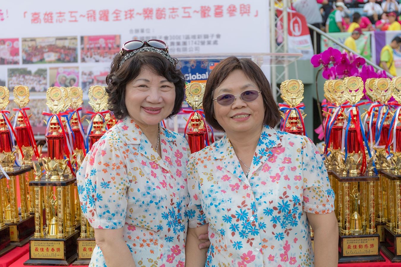 国际志工日运动大会,天国乐团受邀引领队伍进场,图为理事长庄月珠(右)