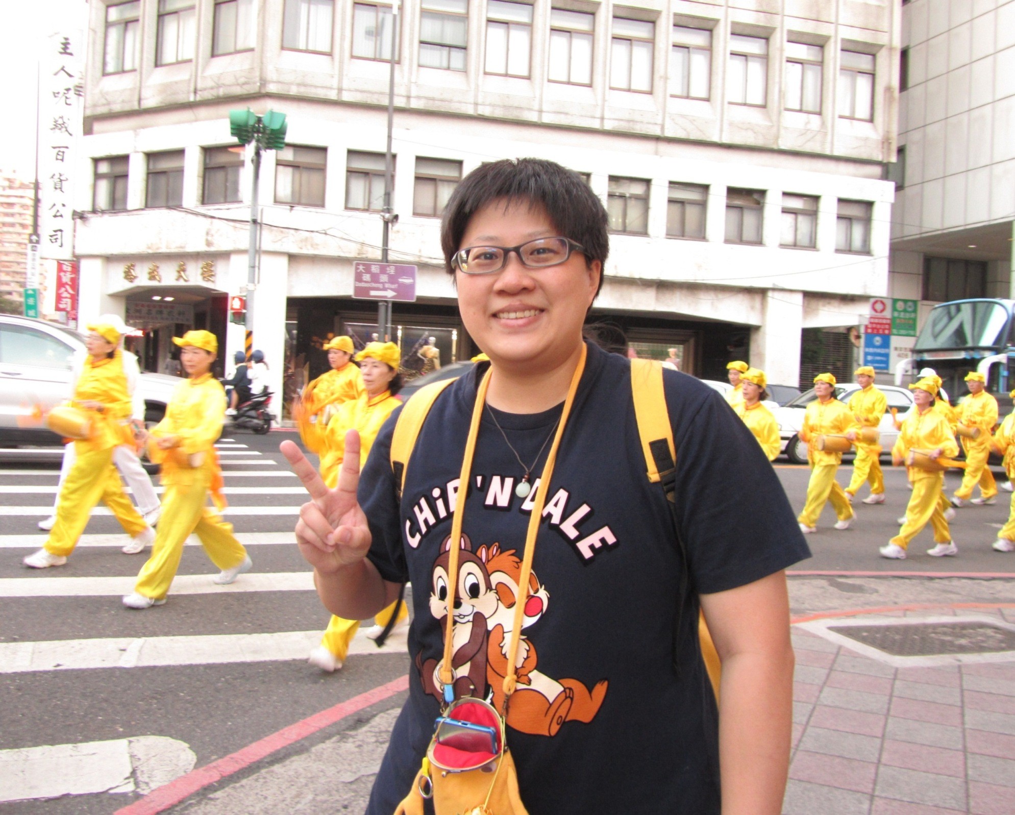法轮功学员参加苗栗客家文化节,在热闹的踩街人群中构成了一幅美好的画面。