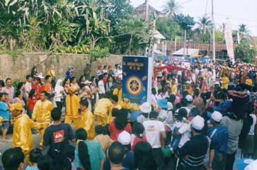 印尼法轮功学员参加巴里岛故德嘉年华会 图为法轮功学员簇拥宝书《转法轮》