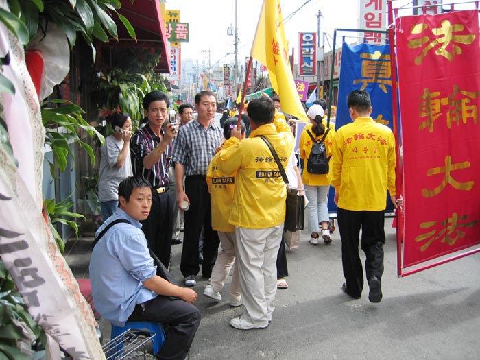反迫害6周年 法轮功学员韩国首尔市大规模游行 呼吁制止中共对法轮功的野蛮镇压 图为游行吸引了路人的关注