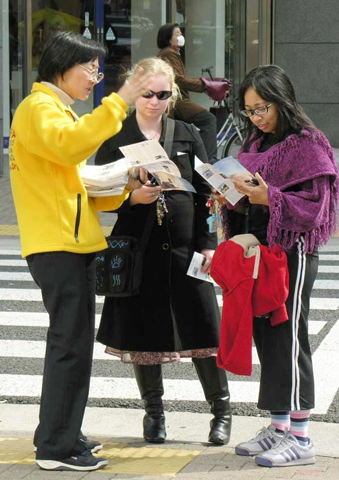 “万博”游行 法轮功震撼名古屋 图为法轮功学员讲真相